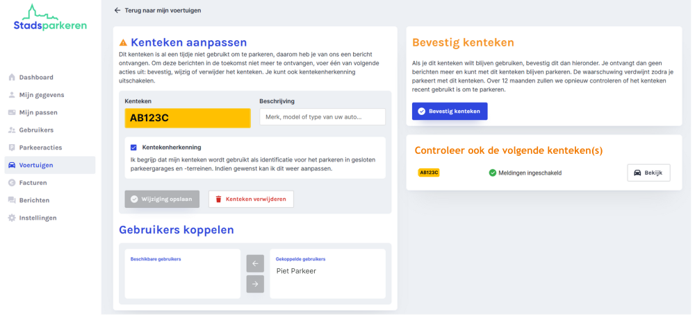 We helpen je graag om zorgeloos te blijven parkeren. Daarom vragen we je om je gegevens te controleren. Dit omdat je al een tijd niet hebt geparkeerd met een of meerdere kentekens die aan je account gekoppeld zijn, terwijl kentekenherkenning nog wel actief is. Bij Stadsparkeren vinden we het belangrijk dat je account up-to-date blijft. Hieronder lees je hoe je dit kunt doen in het Mijn Stadsparkeren web-portaal. Bekijk hier hoe je dit in de app regelt.